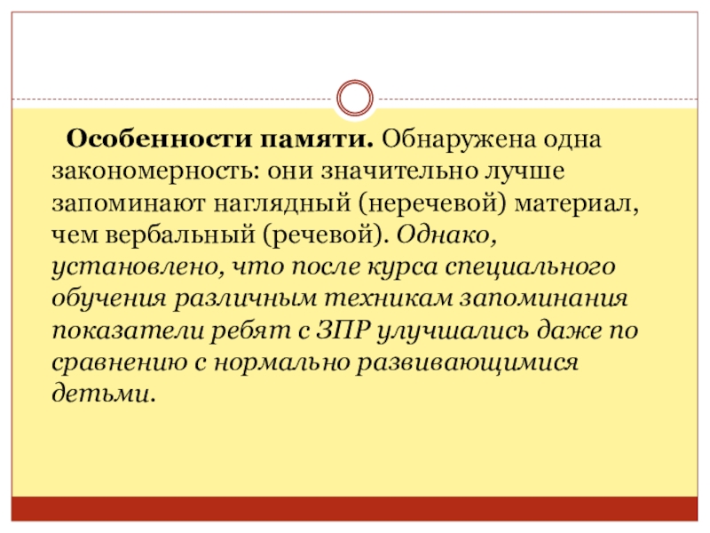 материал, чем вербальный (речевой). Однако, установлено, что после курса специального обучения различным техникам запоминания показатели ребят с ЗПР улучшались даже по сравнению с нормально развивающимися детьми.