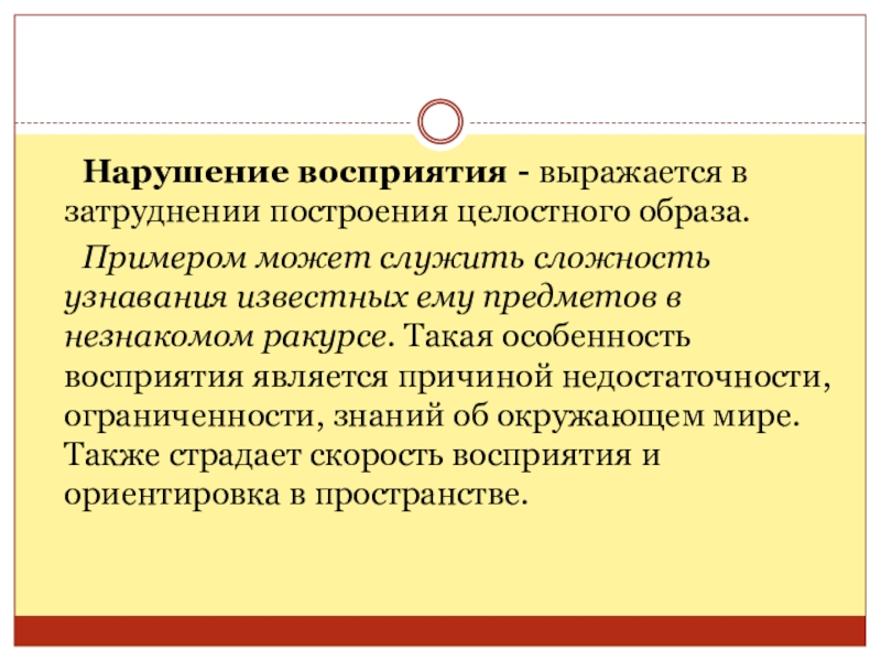 Нарушение восприятия - выражается в затруднении построения целостного образа. 	Примером может служить сложность узнавания известных ему предметов