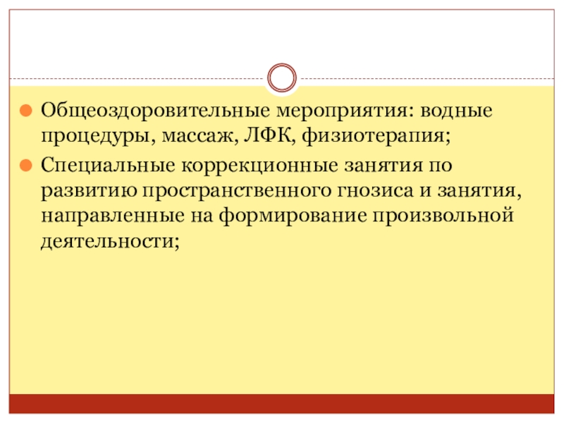 Общеоздоровительные мероприятия: водные процедуры, массаж, ЛФК, физиотерапия;Специальные коррекционные занятия по развитию пространственного гнозиса и занятия, направленные на