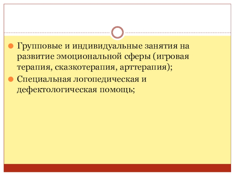 Слайд 24Групповые и индивидуальные занятия на развитие эмоциональной сферы (игровая терапия, сказкотерапия,