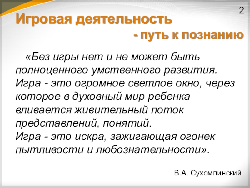 «Без игры нет и не может быть полноценного умственного развития. Игра - это огромное светлое окно, через которое в духовный мир ребенка вливается живительный поток представлений, понятий.