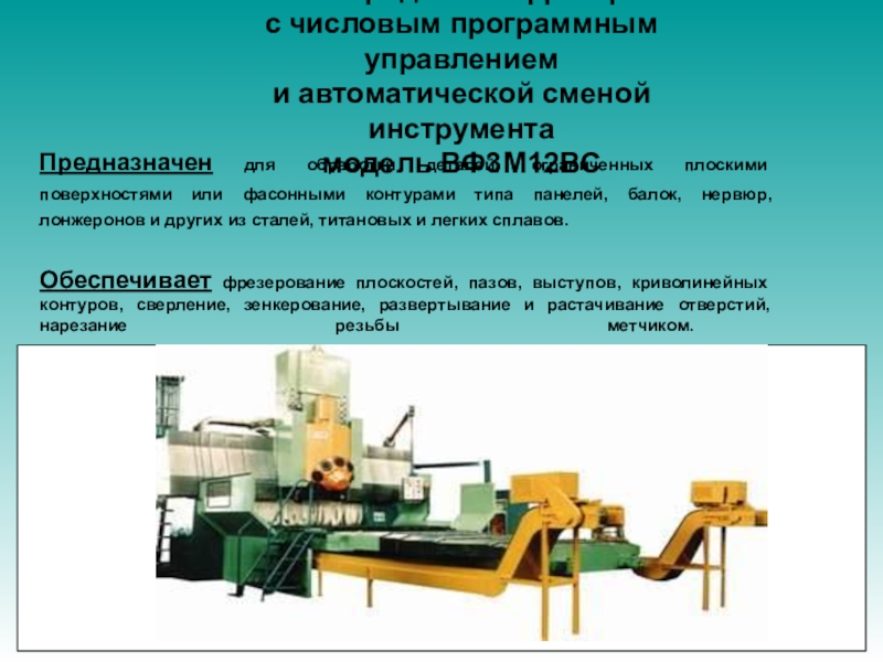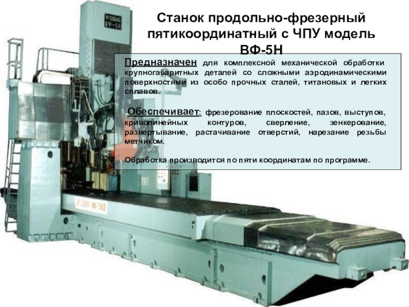 Предназначен для обработки деталей, ограниченных плоскими поверхностями или фасонными контурами типа панелей, балок, нервюр, лонжеронов и других из сталей, титановых и легких сплавов.