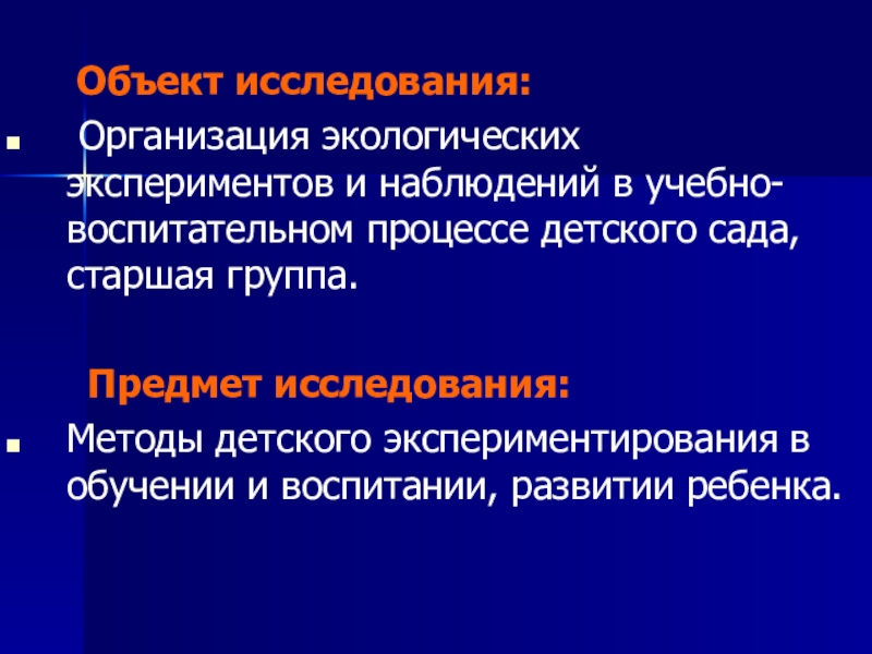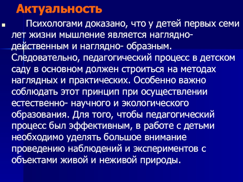 детей первых семи лет жизни мышление является наглядно-действенным и наглядно- образным. Следовательно, педагогический процесс в детском саду в основном должен строиться на методах наглядных и практических. Особенно важно соблюдать этот принцип при осуществлении естественно- научного и экологического образования. Для того, чтобы педагогический процесс был эффективным, в работе с детьми необходимо уделять большое внимание проведению наблюдений и экспериментов с объектами живой и неживой природы.