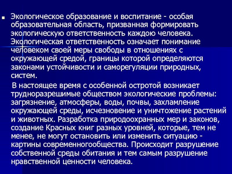 ответственность каждою человека. Экологическая ответственность означает понимание человеком своей меры свободы в отношениях с окружающей средой, границы которой определяются законами устойчивости и саморегуляции природных, систем.