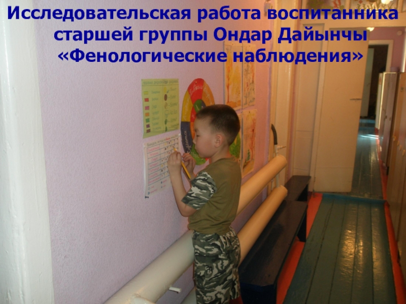 Слайд 13Исследовательская работа воспитанника старшей группы Ондар Дайынчы «Фенологические наблюдения»