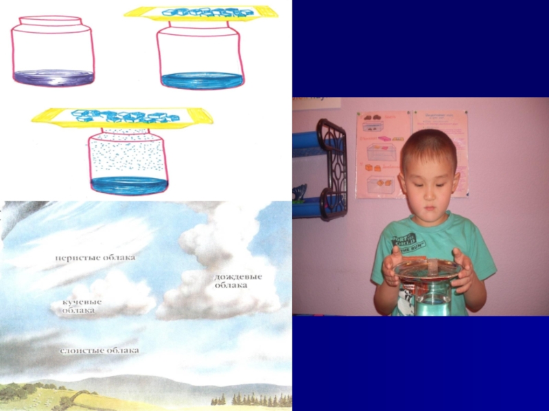 Материал и оборудование: стеклянная банка с горячей водой,металлический лоток,кубики льда, рисунки облаков.