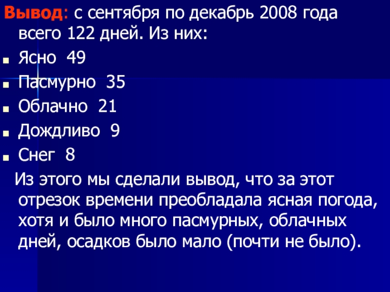 Слайд 16Вывод: с сентября по декабрь 2008 года всего 122 дней. Из