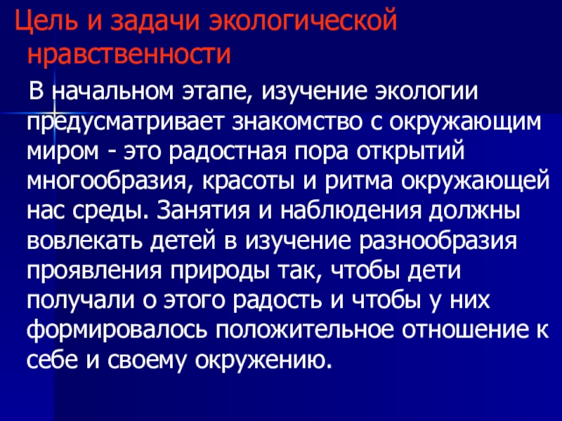 экологии предусматривает знакомство с окружающим миром - это радостная пора открытий многообразия, красоты и ритма окружающей нас среды. Занятия и наблюдения должны вовлекать детей в изучение разнообразия проявления природы так, чтобы дети получали о этого радость и чтобы у них формировалось положительное отношение к себе и своему окружению.