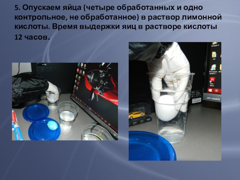 5. Опускаем яйца (четыре обработанных и одно контрольное, не обработанное) в