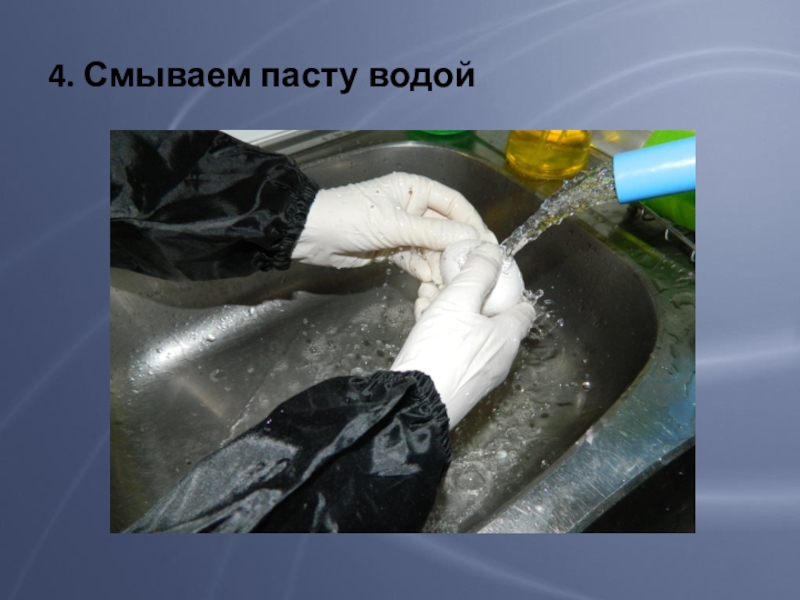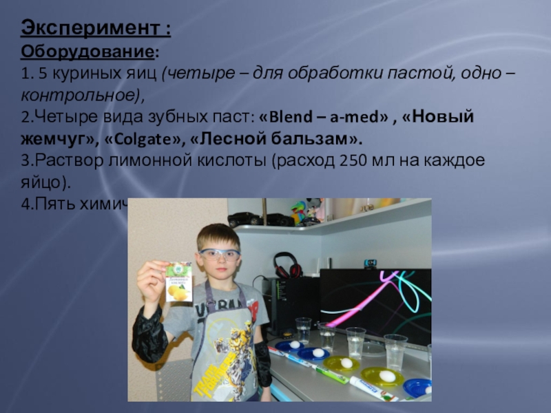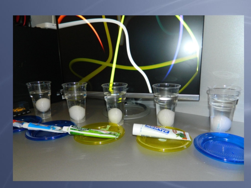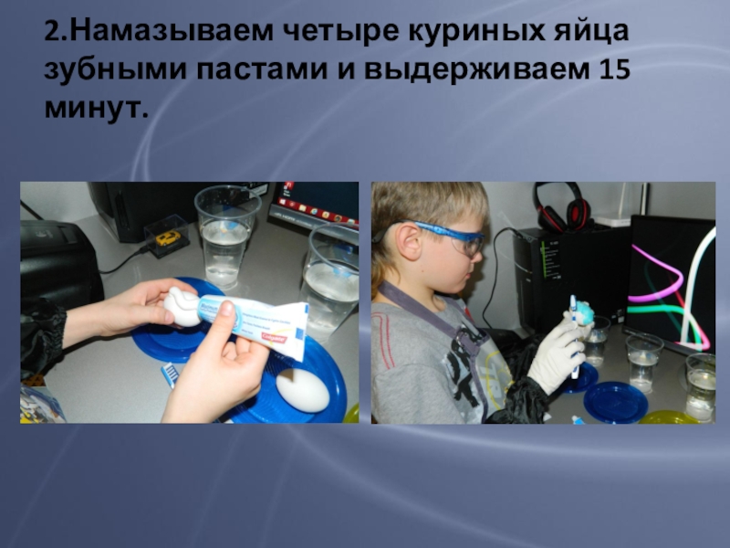Слайд 62.Намазываем четыре куриных яйца зубными пастами и выдерживаем 15 минут.