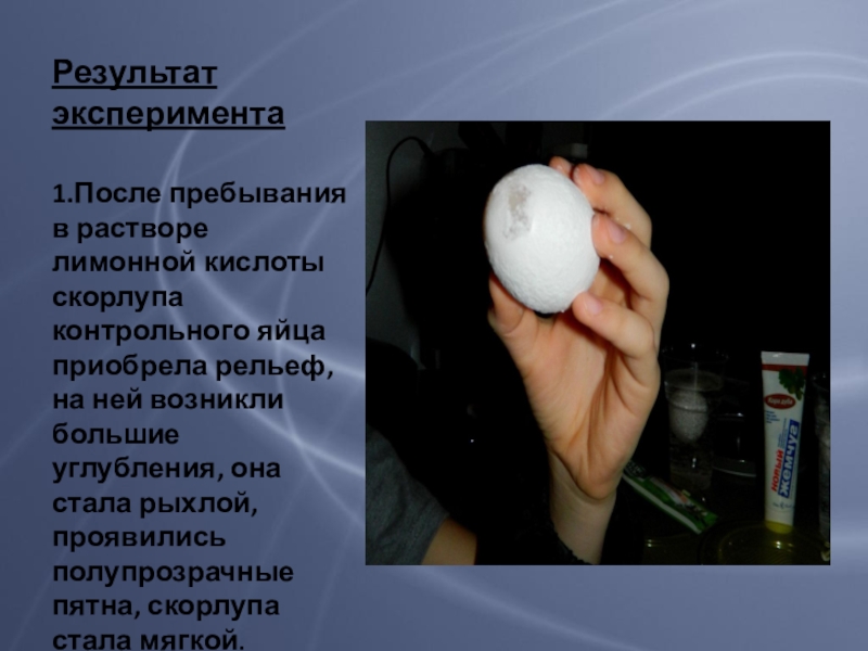 1.После пребывания в растворе лимонной кислоты скорлупа контрольного яйца приобрела