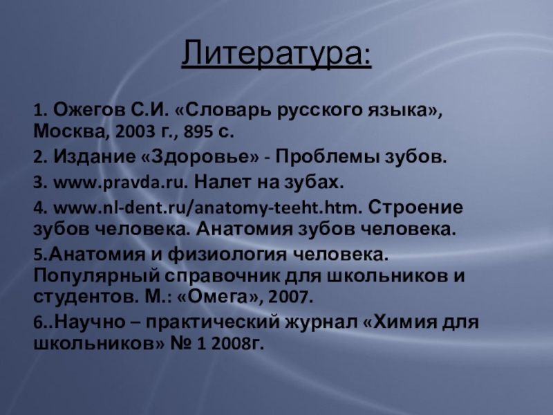 1. Ожегов С.И. «Словарь русского языка», Москва, 2003 г., 895 с.