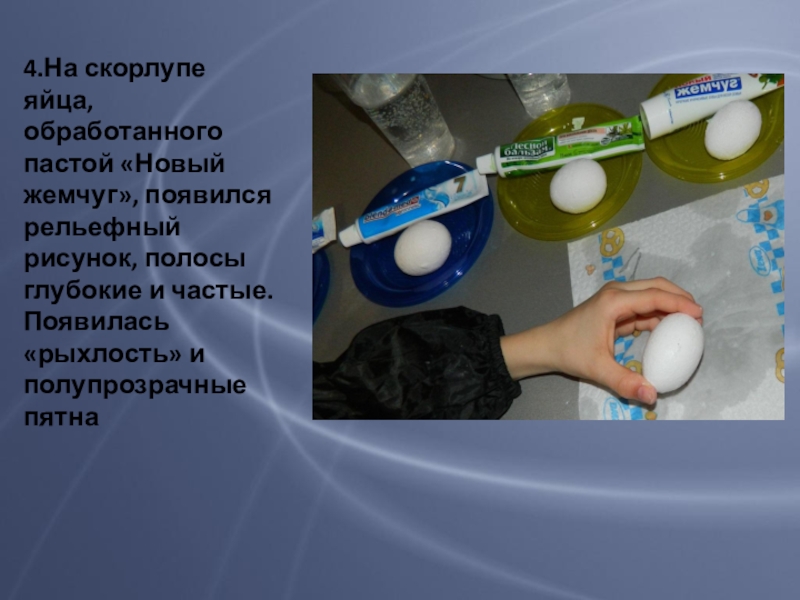 4.На скорлупе яйца, обработанного пастой «Новый жемчуг», появился рельефный рисунок, полосы