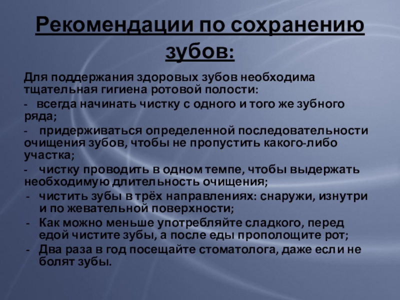 чистить зубы в трёх направлениях: снаружи, изнутри и по жевательной поверхности;