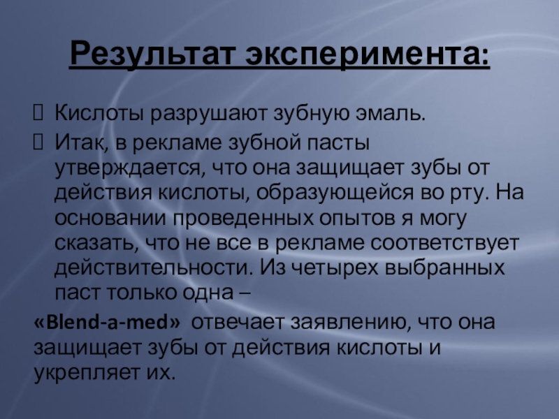 она защищает зубы от действия кислоты, образующейся во рту. На основании проведенных опытов я могу сказать, что не все в рекламе соответствует действительности. Из четырех выбранных паст только одна –