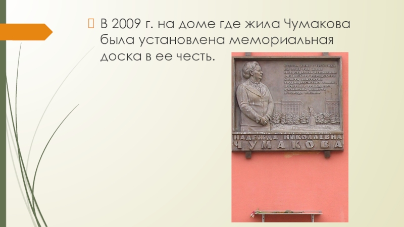 Слайд 15В 2009 г. на доме где жила Чумакова была установлена мемориальная