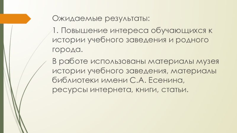 Ожидаемые результаты:1.	Повышение интереса обучающихся к истории учебного заведения и родного города.В работе использованы материалы музея истории учебного