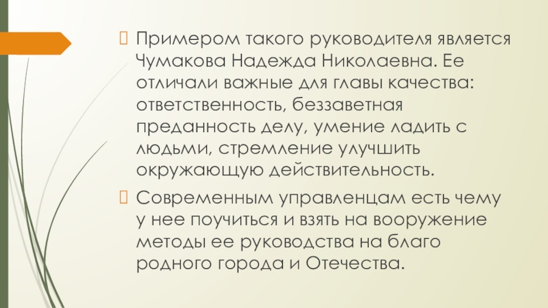 Примером такого руководителя является Чумакова Надежда Николаевна. Ее отличали важные для