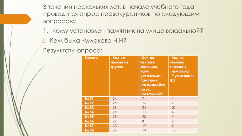 В течении нескольких лет, в начале учебного года проводится опрос первокурсников по следующим вопросам:1.	Кому установлен памятник на