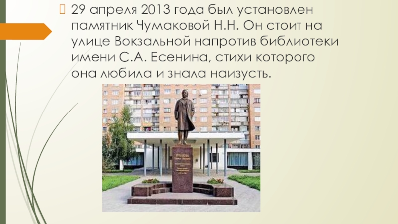 Слайд 1629 апреля 2013 года был установлен памятник Чумаковой Н.Н. Он стоит