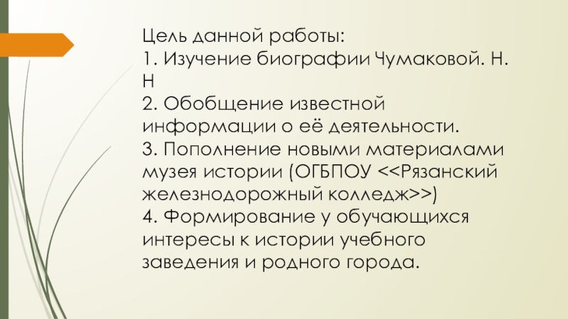 Цель данной работы:1.	Изучение биографии Чумаковой. Н.Н2.	Обобщение известной информации о её деятельности.3.	Пополнение новыми материалами музея истории (ОГБПОУ )4.	Формирование
