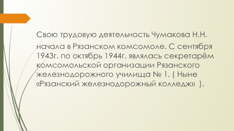Свою трудовую деятельность Чумакова Н.Н.начала в Рязанском комсомоле. С сентября 1943г. по октябрь 1944г. являлась секретарём комсомольской