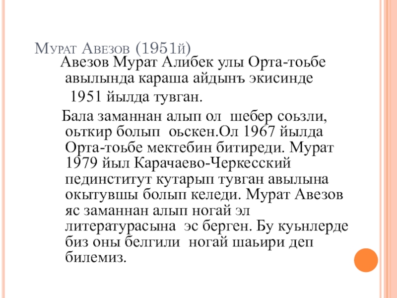 Мурат Авезов (1951й) Авезов Мурат Алибек улы Орта-тоьбе авылында караша айдынъ экисинде 1951 йылда тувган. Бала заманнан алып ол шебер соьзли,оьткир болып оьскен.Ол 1967 йылда Орта-тоьбе мектебин битиреди. Мурат 1979 йыл Карачаево-Черкесский пединститут кутарып