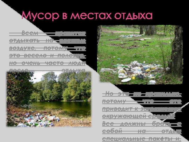Все должны брать с собой на отдых специальные пакеты и, уходя, собирать в них свой мусор.