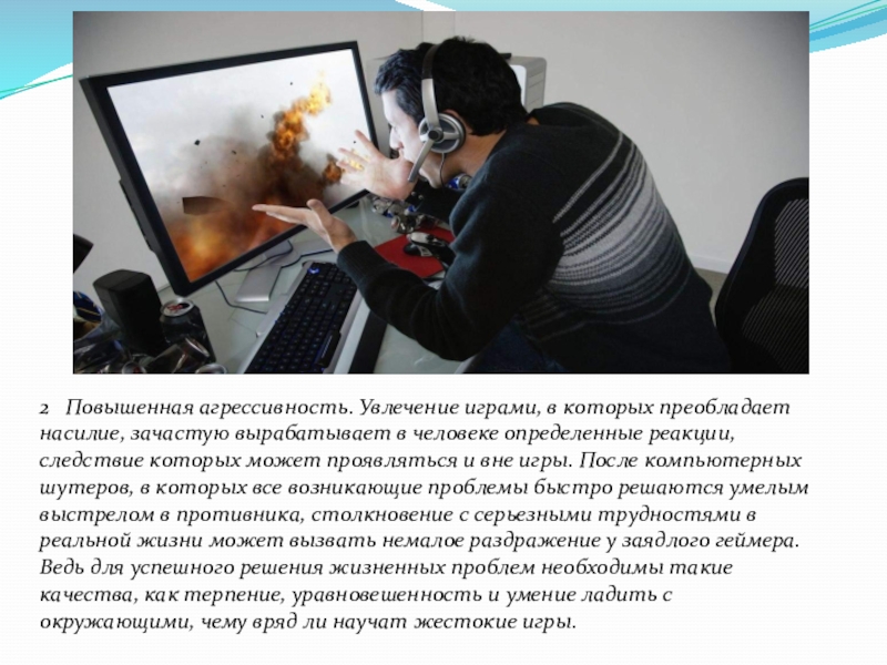 в человеке определенные реакции, следствие которых может проявляться и вне игры. После компьютерных шутеров, в которых все возникающие проблемы быстро решаются умелым выстрелом в противника, столкновение с серьезными трудностями в реальной жизни может вызвать немалое раздражение у заядлого геймера. Ведь для успешного решения жизненных проблем необходимы такие качества, как терпение, уравновешенность и умение ладить с окружающими, чему вряд ли научат жестокие игры.