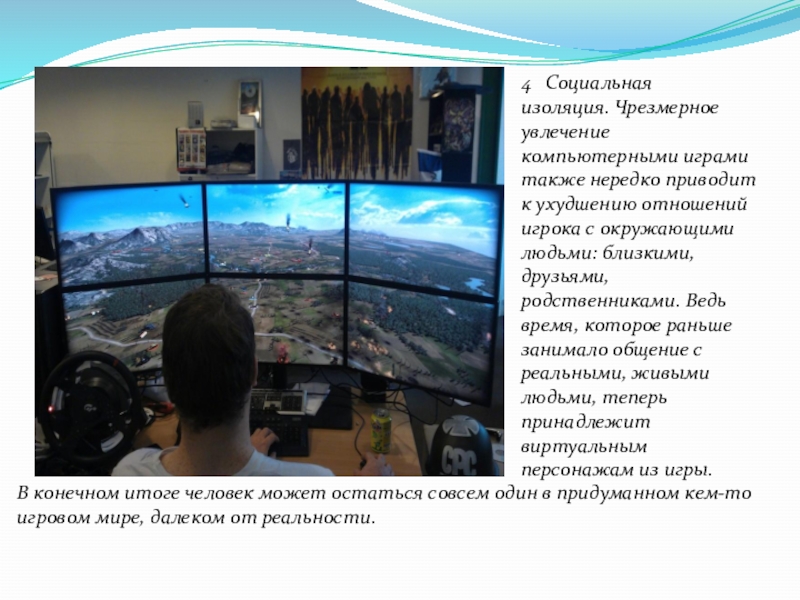 4 Социальная изоляция. Чрезмерное увлечение компьютерными играми также нередко приводит к ухудшению отношений игрока с окружающими людьми: близкими, друзьями, родственниками. Ведь время, которое раньше занимало общение с реальными, живыми людьми, теперь принадлежит виртуальным персонажам из игры.