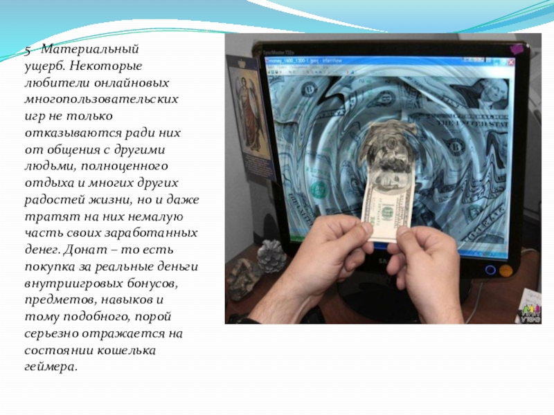Слайд 105 Материальный ущерб. Некоторые любители онлайновых многопользовательских игр не только отказываются