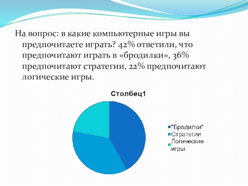 Слайд 19На вопрос: в какие компьютерные игры вы предпочитаете играть? 42% ответили,