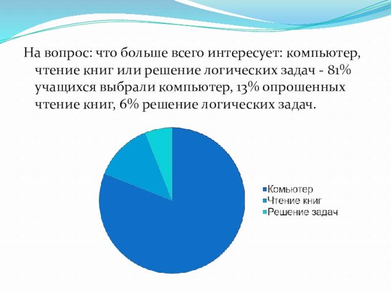 Слайд 18На вопрос: что больше всего интересует: компьютер, чтение книг или решение