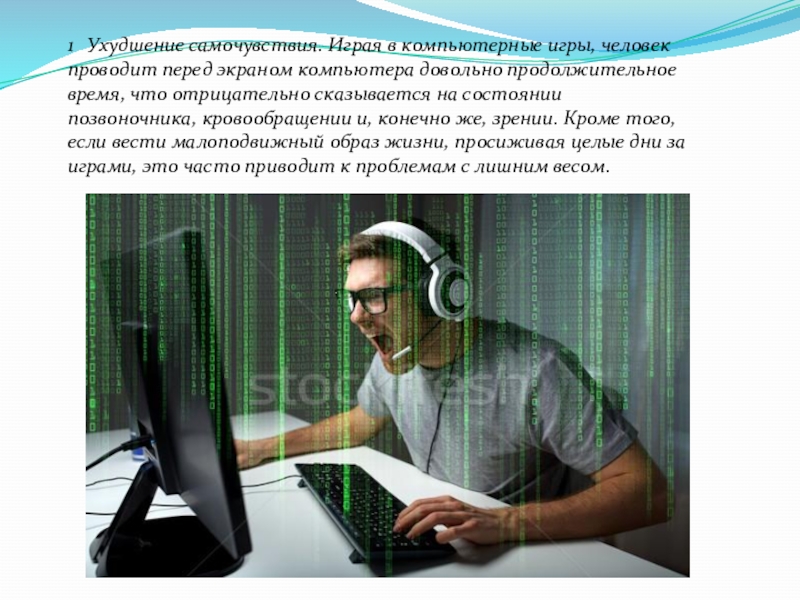 Слайд 61 Ухудшение самочувствия. Играя в компьютерные игры, человек проводит перед