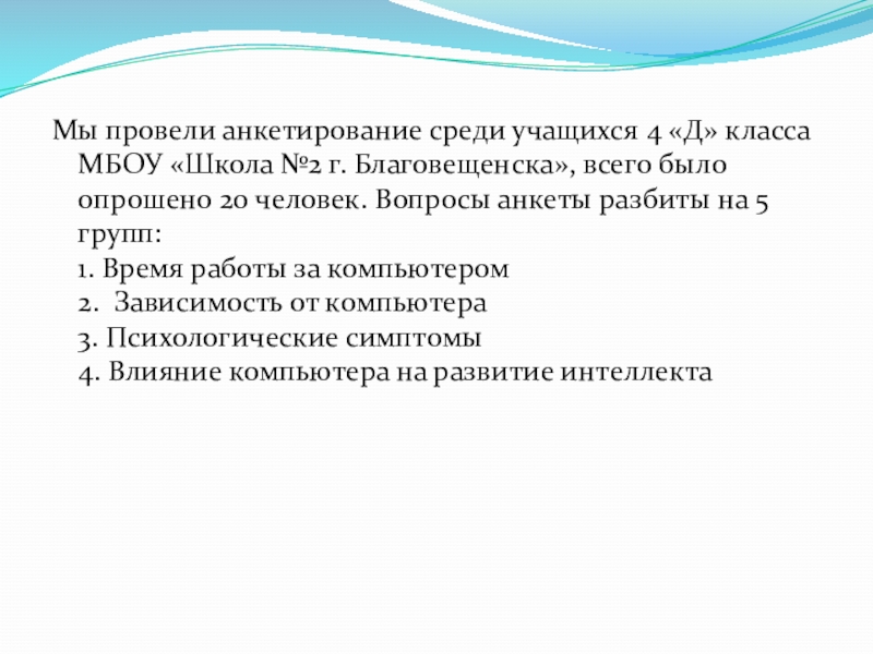 Слайд 15Мы провели анкетирование среди учащихся 4 «Д» класса МБОУ «Школа №2