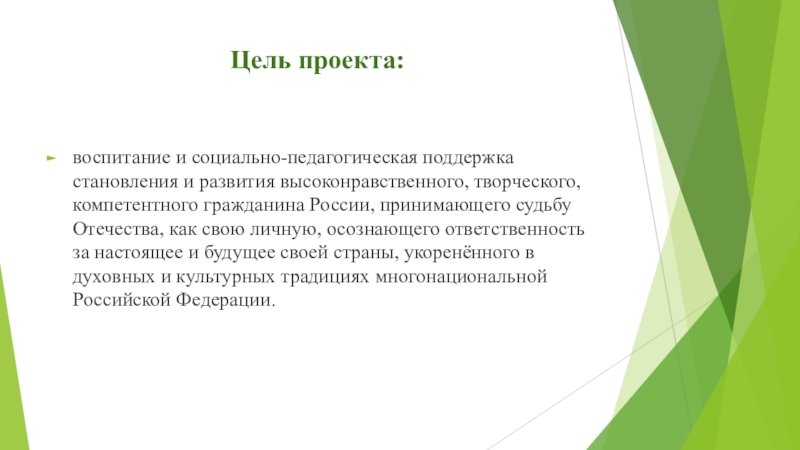 гражданина России, принимающего судьбу Отечества, как свою личную, осознающего ответственность за настоящее и будущее своей страны, укоренённого в духовных и культурных традициях многонациональной Российской Федерации.