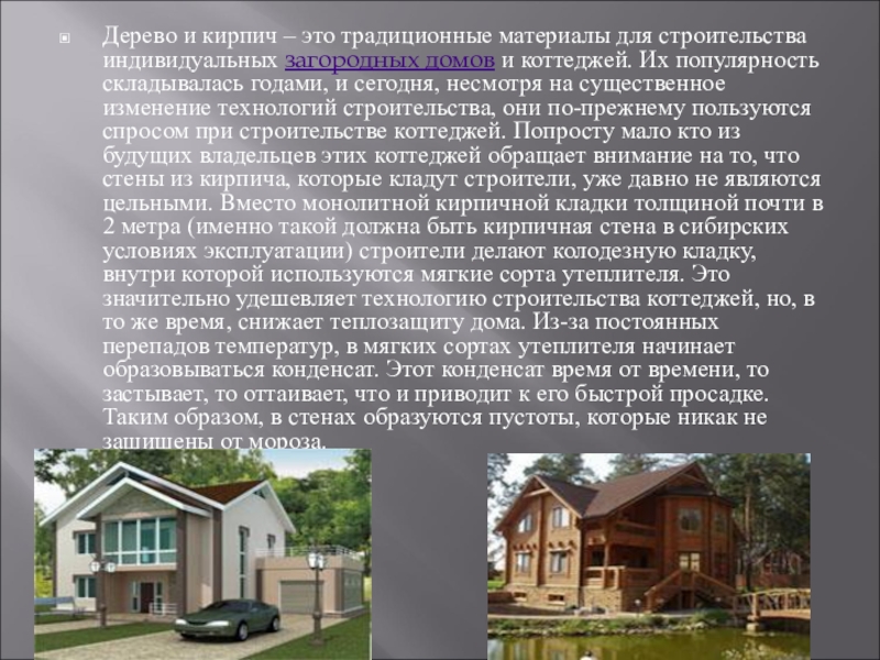 Слайд 6Дерево и кирпич – это традиционные материалы для строительства индивидуальных загородных