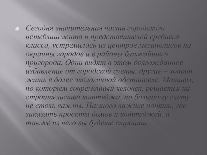 центров мегаполисов на окраины городов и в районы ближайшего пригорода. Одни видят в этом долгожданное избавление от городской суеты, другие – хотят жить в более экологичной обстановке. Мотивы, по которым современный человек, решается на строительство коттеджа, по большому счету не столь важны. Намного важнее понять, где заказать проекты домов и коттеджей, а также из чего вы будете строить.