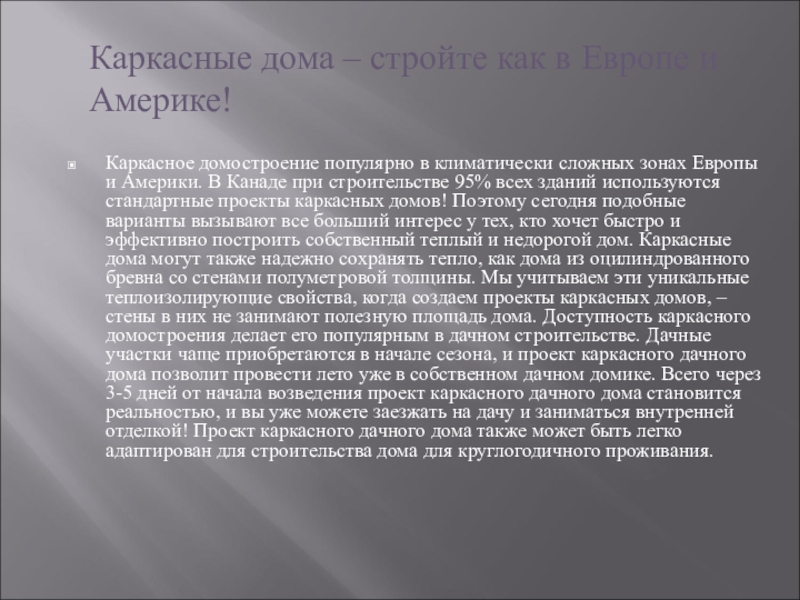 Канаде при строительстве 95% всех зданий используются стандартные проекты каркасных домов! Поэтому сегодня подобные варианты вызывают все больший интерес у тех, кто хочет быстро и эффективно построить собственный теплый и недорогой дом. Каркасные дома могут также надежно сохранять тепло, как дома из оцилиндрованного бревна со стенами полуметровой толщины. Мы учитываем эти уникальные теплоизолирующие свойства, когда создаем проекты каркасных домов, – стены в них не занимают полезную площадь дома. Доступность каркасного домостроения делает его популярным в дачном строительстве. Дачные участки чаще приобретаются в начале сезона, и проект каркасного дачного дома позволит провести лето уже в собственном дачном домике. Всего через 3-5 дней от начала возведения проект каркасного дачного дома становится реальностью, и вы уже можете заезжать на дачу и заниматься внутренней отделкой! Проект каркасного дачного дома также может быть легко адаптирован для строительства дома для круглогодичного проживания.