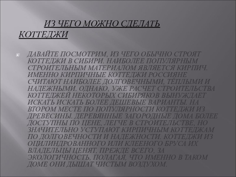 Слайд 5ДАВАЙТЕ ПОСМОТРИМ, ИЗ ЧЕГО ОБЫЧНО СТРОЯТ КОТТЕДЖИ В СИБИРИ. НАИБОЛЕЕ ПОПУЛЯРНЫМ