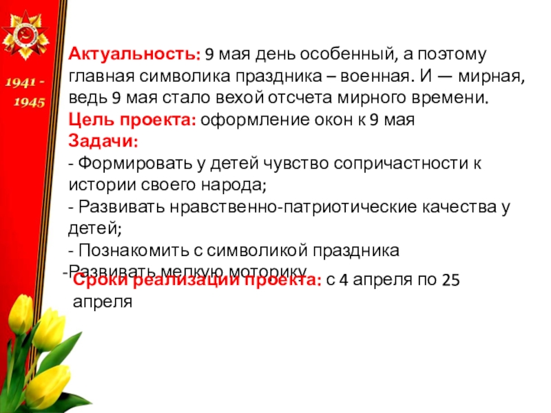 Сроки реализации проекта: с 4 апреля по 25 апреля