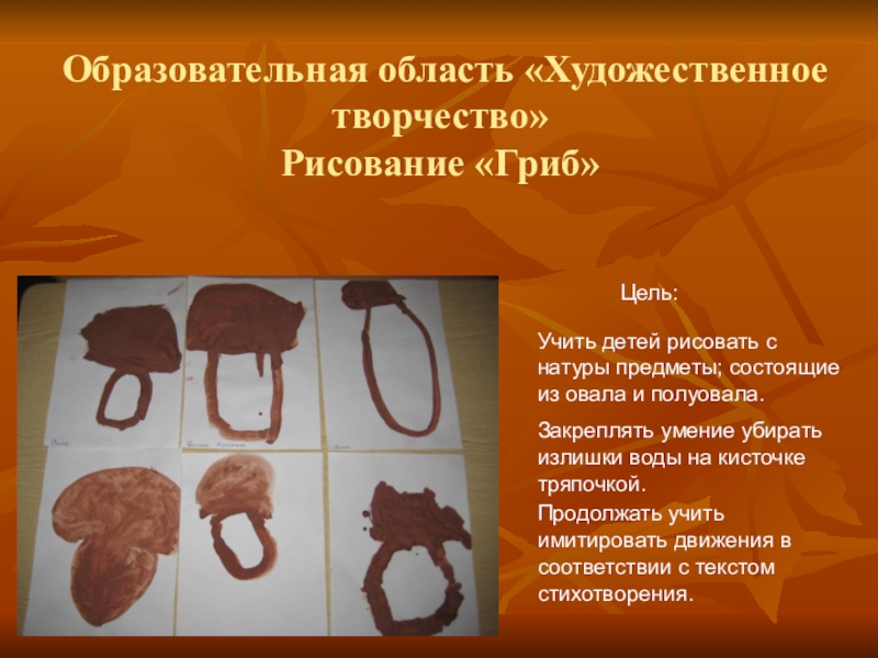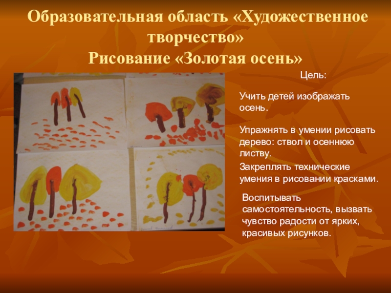 Упражнять в умении рисовать дерево: ствол и осеннюю листву.