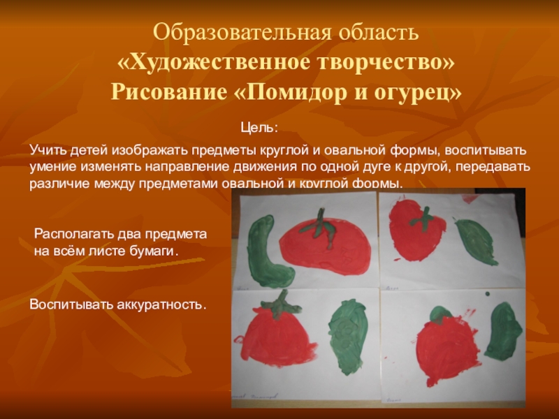 Учить детей изображать предметы круглой и овальной формы, воспитывать умение изменять направление движения по одной дуге к другой, передавать различие между предметами овальной и круглой формы.