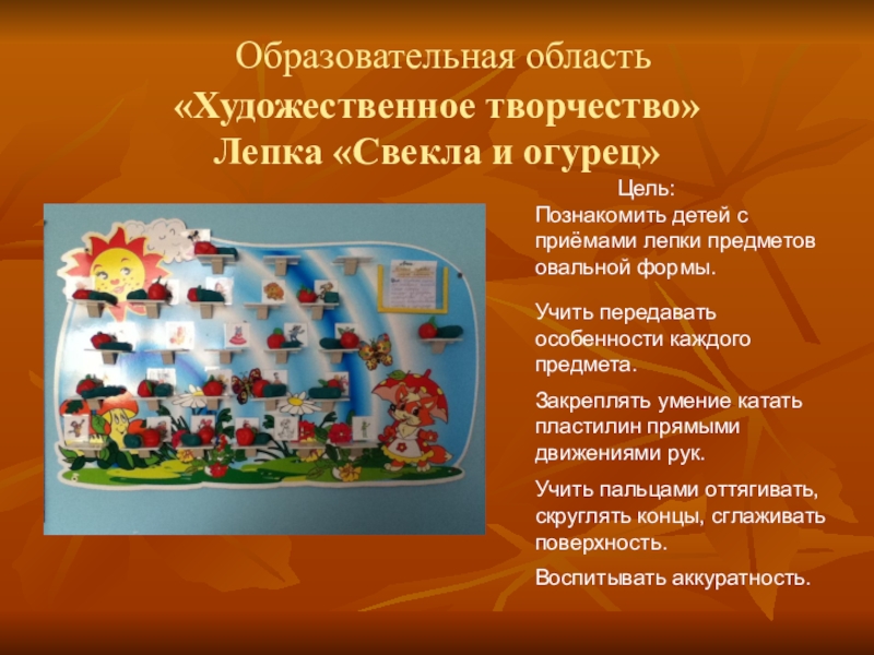 Закрепить умение выделять характерные признаки овощей, фруктов: цвет, форма, вкус, поверхность.