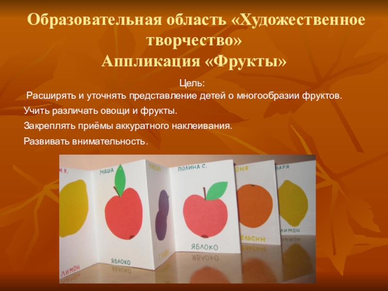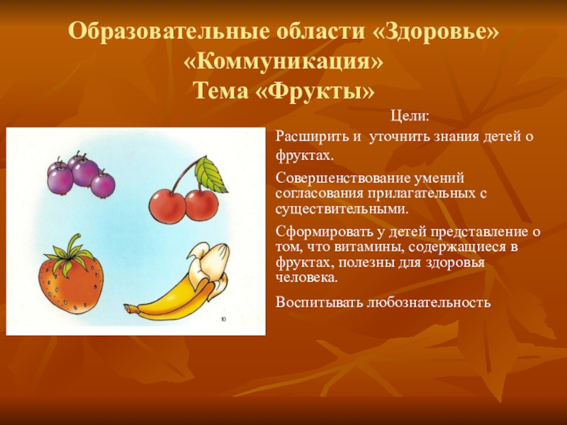 Сформировать у детей представление о том, что витамины, содержащиеся в фруктах, полезны для здоровья человека.