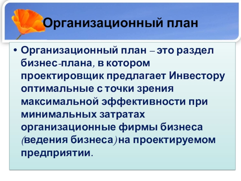 Организационный план – это раздел бизнес-плана, в котором проектировщик предлагает