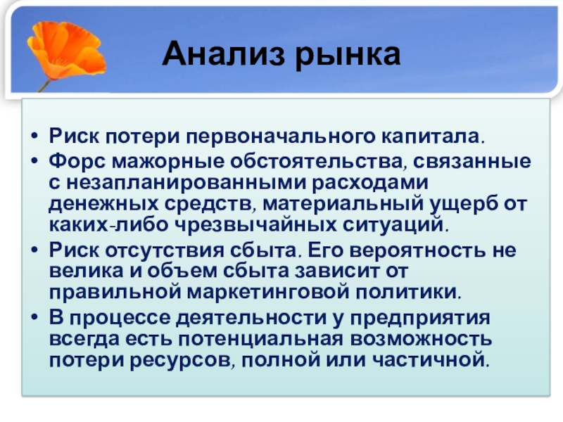 Риск отсутствия сбыта. Его вероятность не велика и объем сбыта зависит от правильной маркетинговой политики.