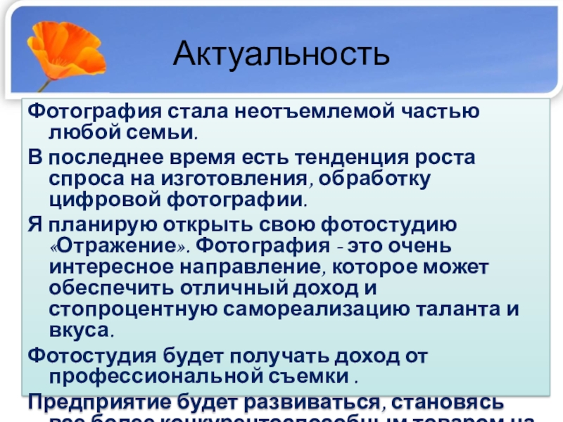 Я планирую открыть свою фотостудию «Отражение». Фотография - это очень интересное направление, которое может обеспечить отличный доход и стопроцентную самореализацию таланта и вкуса.