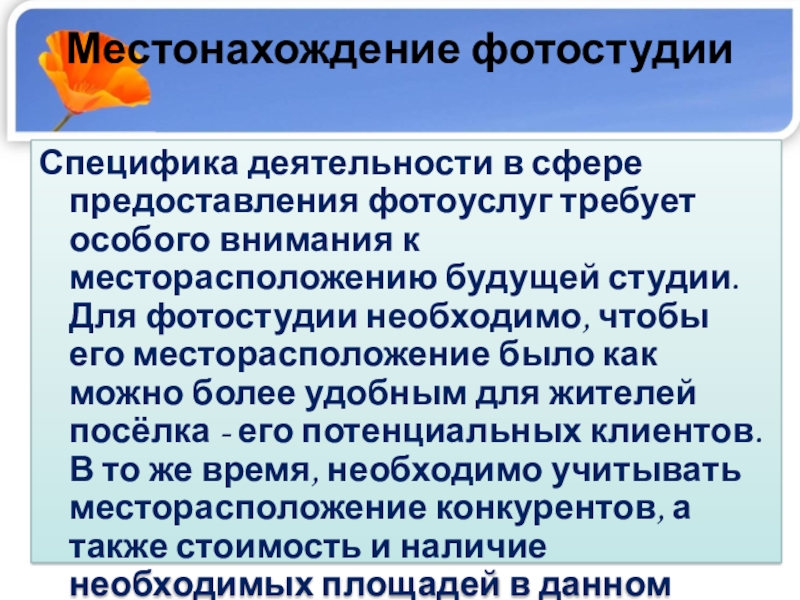 месторасположению будущей студии. Для фотостудии необходимо, чтобы его месторасположение было как можно более удобным для жителей посёлка - его потенциальных клиентов. В то же время, необходимо учитывать месторасположение конкурентов, а также стоимость и наличие необходимых площадей в данном районе.