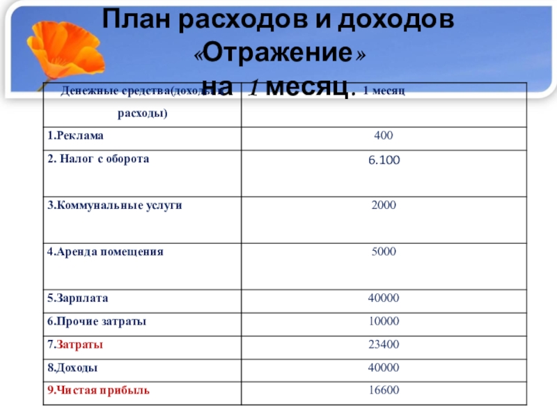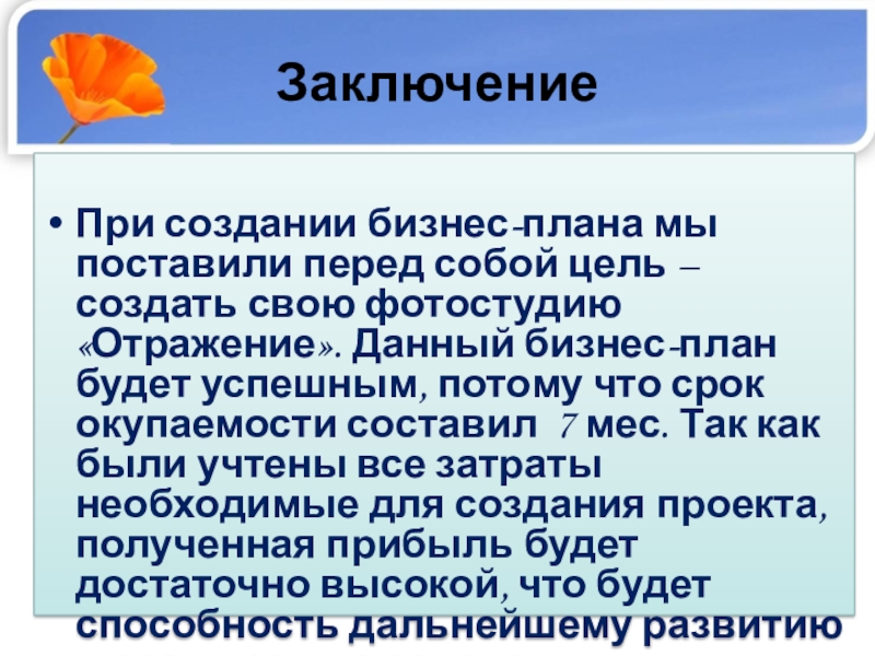 фотостудию «Отражение». Данный бизнес-план будет успешным, потому что срок окупаемости составил 7 мес. Так как были учтены все затраты необходимые для создания проекта, полученная прибыль будет достаточно высокой, что будет способность дальнейшему развитию и расширению салона.